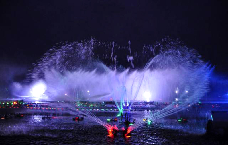 隨著音樂節拍,水柱時而高時而低,時而左時而右,時而呈柱狀,時而呈喇叭狀;隨著光影變化,水柱不斷變換舞姿,一會兒像天女散花,一會兒像孔雀開屏,一會兒又像水中芭蕾:隨著激光閃爍,“西雙版納歡迎您”字樣、傣樓、大象、孔雀等圖案輪翻呈現……