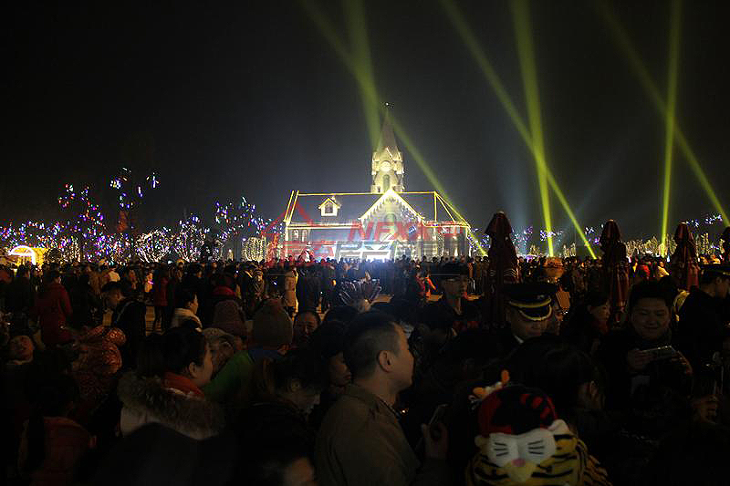 五光十色的酷炫激光、歡快動人的音樂,水霧與光折射出的果城著名景點萬卷樓、白塔等,吸引上萬市民前來觀看。