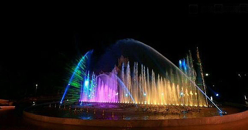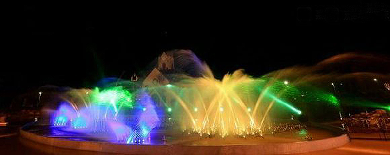 噴泉會隨著音樂的變化而變化,水柱時高時低,跟著音樂一起起舞,絢麗奪目的燈光打在水柱上,五顏六色,煞是好看。